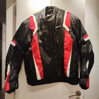 Chaqueta de moto con diseño moderno y detalles reflectantes. - Tejido resistente y transpirable. - Inserciones en color negro y rojo. - Cierre frontal con cremallera y solapa.