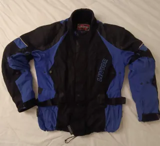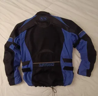 Chaqueta de moto Levior en talla L , con un diseño moderno en color azul y negro. - Con protecciones en hombros, codos y espalda acolchada. - Cierre frontal con cremallera y solapa. Múltiples bolsillos, exterior e interior. - Acolchado interior extraible. - Mangas ajustables con velcro y correa sujeccion. - Ajustes en mangas y cintura. - Cuello alto. - Tejido Airguard/Texland (Cordura) - Nunca accidentada.