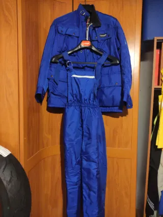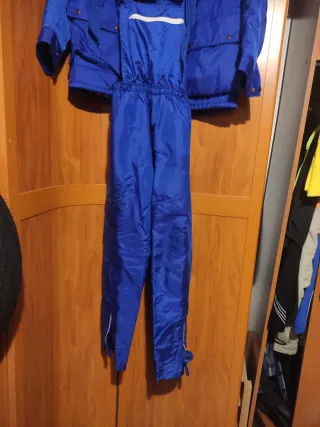 Conjunto de chaqueta y peto impermeable en color azul muy cálido para nieve, moto, campo, e.t.c. - Chaqueta con cuello alto y forro interior. -Pantalón Peto con tirantes ajustables y bolsillo lateral y frontal. - Tejido exterior resistente al agua. - Aislamiento Thinsulate para mayor calidez. Se ha usado muy poco.