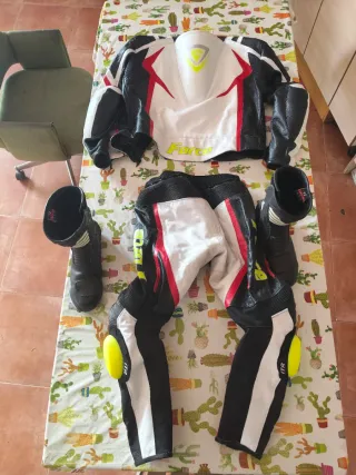 Se vende el lote completo, traje+botas+espaldera. Traje de moto de piel de la marca Alpinestars, diseñado para ofrecer protección y estilo en la carretera. - Chaqueta de cuero con paneles en rojo, blanco y negro. Talla 54 eur 44 usa - Pantalón de cuero negro, rojo y blanco. Talla 54 eur 38 usa - Diseño deportivo con logo de Alpinestars. Botas Alpinestar talla 44 europeo Espaldera Dainesse Y pareja de guantes de regalo, haciendo juego con el traje