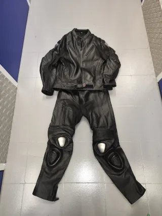 Conjunto de mono de cuero para moto de dos piezas. - Chaqueta con cremallera frontal. - Pantalones con protecciones en rodillas. - Material: Cuero. -Talla XL -Sin uso