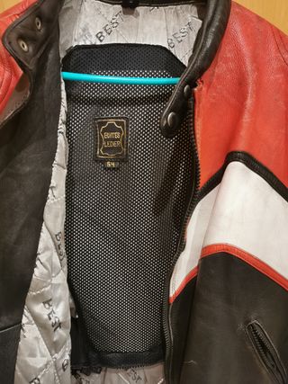 Chaqueta de cuero para moto de la marca Best, con un diseño deportivo en rojo, blanco y negro. - Material de cuero. - Doble cremallera frontal. - Bolsillos con cremallera. - Cuello con cierre de botón. - Talla 54
