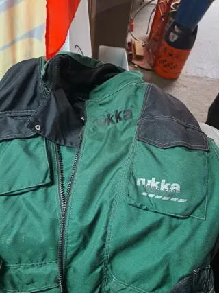Chaqueta de moto Rukka en color verde y negro, talla XL. - Diseño con múltiples bolsillos. - Cierre de cremallera frontal. - Cuello alto.