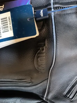 Chaqueta de cuero negra de la marca Triumph, nueva a estrenar. - Diseño de chaqueta de moto. - Detalles de rayas blancas en las mangas. - Cierre de cremallera frontal. - Múltiples bolsillos con cremallera.