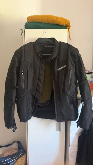 Chaqueta de moto negra de la marca GEARX. Diseño moderno y funcional. Talla M. Da poca talla. A penas usada porque me está pequeña. - Cremalleras frontales y en bolsillos. - Detalles acolchados en hombros. - Cierre de cuello ajustable. - protecciones rígidas