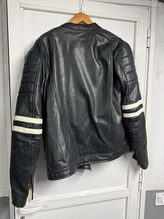 Chaqueta de piel negra con detalles blancos en las mangas, estilo café racer. Protecciones en codos y hombros Forro extraible Talla XXL pero talla como XL.