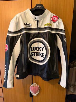 Chaqueta de moto con diseño inspirado en Lucky Strike, Arai y Michelin. Fabricada en cuero, combina paneles en blanco y negro para un look deportivo. - Diseño con logos de Lucky Strike en pecho y mangas. - Parche de Arai Helmet en el hombro. - Detalle de Michelin en la solapa. - Cierre de cremallera frontal. - Puños ajustables.