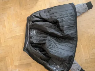Chaqueta de moto con diseño moderno y detalles en gris y blanco. - Cierre frontal con cremallera y solapa. - Múltiples bolsillos con cremallera. - Cinturón ajustable en la cintura. - Puños ajustables.tiene protecciones en espalda , hombros y codos.