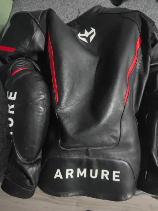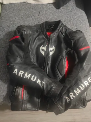 Chaqueta de cuero para moto con detalles en rojo y blanco. - Diseño con logo en el pecho. - Inscripción ARMURE en las mangas. - Cierre de cremallera frontal. -Protecciones.. Codos.. Espalda y hombros