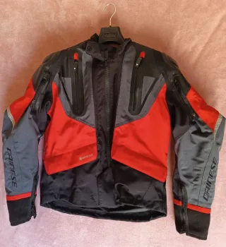 Chaqueta de moto Dainese Gore-Tex, ideal para protegerte en tus rutas. Muestra señales de uso. - Marca: Dainese - Con protecciones en hombros y codos - Color: Negro, rojo y gris Incluye protector para la espalda muy cómodo para una protección completa Sólo envíos