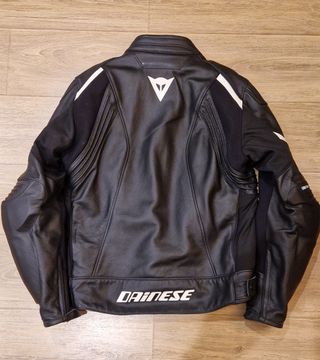 Chaqueta de moto Dainese de Cuero con protecciones en brazos y hombros. Tiene forro extraible para usarse durante todo el año. Utilizada una única vez, está nueva. Talla 54