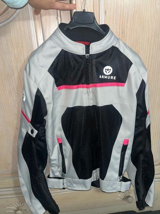 Chaqueta de moto para mujer de la marca Armure, con un diseño moderno y detalles en rosa. Se compró en Abril 2025 para las motos de Jerez y solo se ha usado en esa ocasión. - Color principal gris con detalles en negro y rosa. - Cierre de cremallera frontal. - Bolsillos con cremallera.