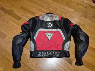 Chaqueta de motorista Dainese de piel, con un diseño deportivo y llamativo. - Combinación de colores negro, rojo y blanco. - Logos de la marca Dainese en pecho y mangas. - Protecciones en hombros. Protecciones, talla 50. Tiene dos salidas. La vendo por error de talla. Óptima para altura de 175cm. Ninguna marca de uso. Está como nueva.