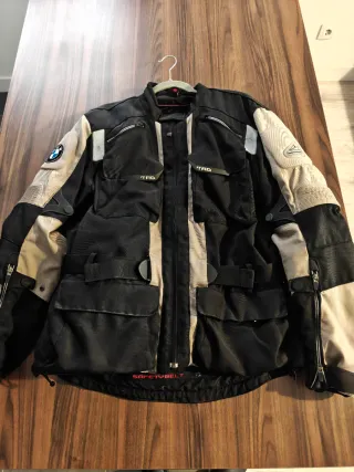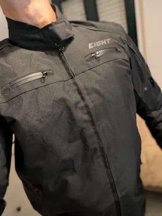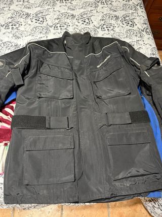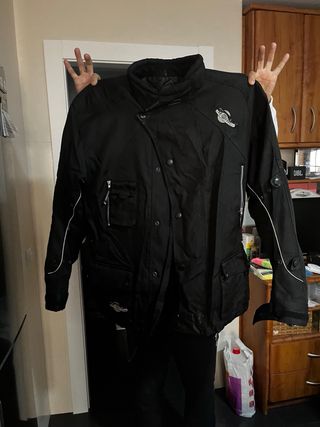Chaqueta de cordura para moto, ideal para invierno. Diseñada para aventura y touring. - Color negro con detalles en rojo. - Cierre frontal con cremallera. talla L, yo peso 73kg y mido 1,74m - Múltiples bolsillos frontales.
