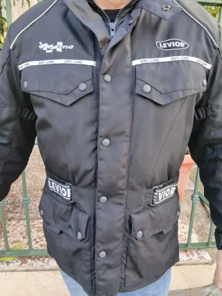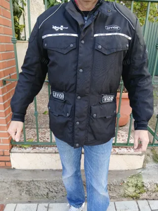 Chaqueta de motorista Levior en color negro. Cuenta con múltiples bolsillos y detalles. UN SOLO USO UN DIA QUE SE PUSO. VERLA EN VIVO Y COMPROBARAS QUE ESTA NUEVA. - Cierre principal con cremallera y botones. - Múltiples bolsillos frontales con solapa. - Ajustes en cintura y puños. - Detalles de marca en pecho y mangas.