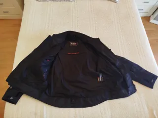 Chaqueta de motorista Levior con un diseño moderno y detalles llamativos. UN SOLO USO DE UN DIA ESTA NUEVA,VERLA EN VIVO PARA COMPROBAR SU ESTADO IMPECABLE. LLEVA REFUERZOS CODERAS, HOMBRERAS, Y SE DESMONTA INTERIOR PARA MAS LIVIANO EN VERANO - Combinación de colores negro y azul. - Cierre frontal con botones. - Ajustes en cintura.
