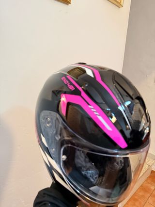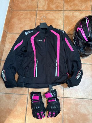 Conjunto de equipamiento para motociclismo. Están como nuevo, tiene muy pocos usos, si necesita mas fotos, puedo pasarlas. - Chaqueta de motorista con detalles en rosa. - Casco integral con diseño deportivo. - Guantes de moto a juego.