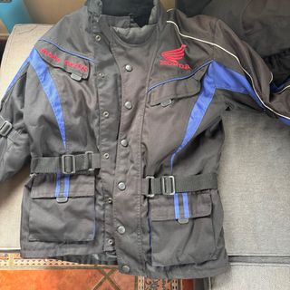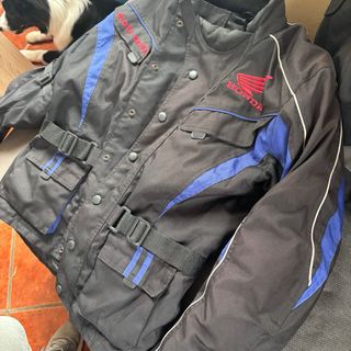 Chaqueta de moto Honda en talla M, con detalles en negro y azul. Diseñada para touring. - Cierre frontal con botones. - Bolsillos frontales con solapa. - Cinturón ajustable en la cintura. - Detalles de ribetes en azul.