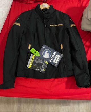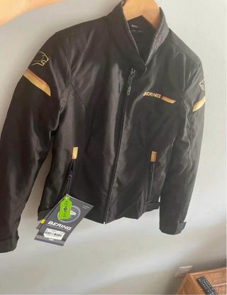 Chaqueta de moto BERING en color negro con detalles dorados. Talla S. - Incluye protecciones Omega. - Cierre de cremallera frontal. - Cuello alto.