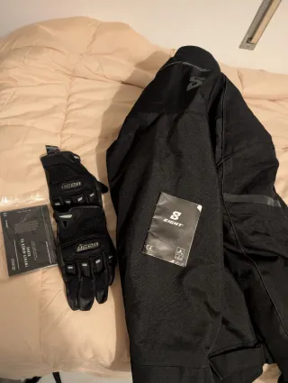 Conjunto de chaqueta y guantes de moto en color negro. Mido 187 cm de alto y peso 82 kg. - Chaqueta de moto. - Guantes ICON Twenty-Niner CE Glove. Nuevo estado. Usado solo unas pocas veces.