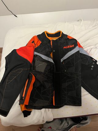 Chaqueta de moto KTM con un diseño moderno y llamativo. - Combinación de colores negro y naranja. - Detalles reflectantes grises. - Cremalleras y bolsillos frontales. Preguntad precio, oigo ofertas