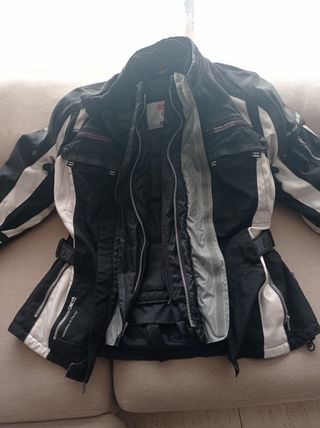 Ideal para primavera y verano ya que no tiene forro interior de invierno, pero tiene dos grandes cremalleras delanteras que abren a mallas de ventilación y salidas de ventilación traseras. Ceñido de brazos y cintura ajustables En perfecto estado Puse gomas en las coderas porque así me son más cómodas. Limpio y sin olores Cualquier pregunta no dudes en consultarme Mas equipo de moto en mi perfil - Diseño deportivo. - Tejido ligero y transpirable. - Cremalleras funcionales. - Bolsillos múltiples.