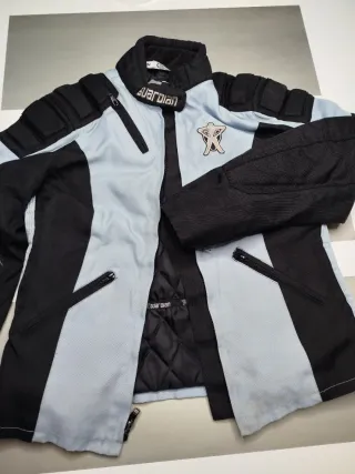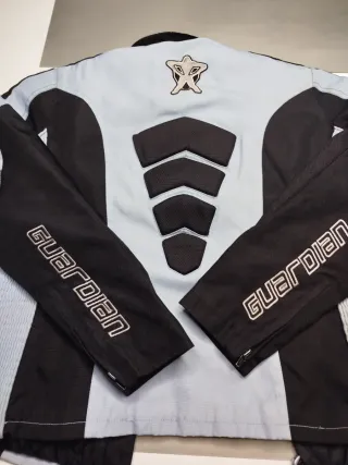 Chaqueta de moto con diseño moderno y detalles protectores. - Color azul claro y negro. - Logo de Guardian en el cuello y parche en el pecho. - Cremalleras frontales y en bolsillos. - Interior acolchado.