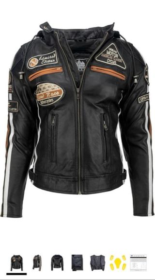 Chaqueta de cuero estilo motero de la marca URBAN. No se ha llegado a usar ni una sola vez, pero le quite la etiqueta . Esta completamente nueva. El motivo de la venta es q vendimos la moto. - Diseño con parches y detalles de rayas en las mangas. - Cremallera frontal. - Cuello alto con cierre de botón. - Bolsillos con cremallera.