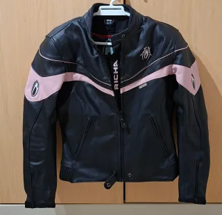 Chaqueta de moto Richa de piel para mujer. Talla 40 aunque es mas como una talla M Medidas: -Axila a axila 50 cm -Cintura 44 cm -Ancho de manga 19 cm -Largo desde hombro 55 cm Tiene protecciones en codos ,hombros y espalda - Material: Cuero. - Color: Negro y rosa con detalles bordados en rosa. - Logo de la marca en la parte frontal y en las mangas. - Cremalleras en los puños. - Cinturón ajustable en la parte inferior.