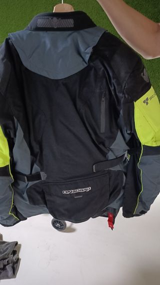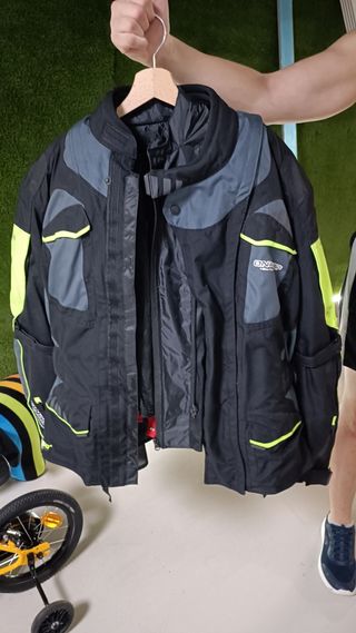 Equipación completa para moto, ideal para cualquier tipo de conductor. - Chaqueta de moto negra con detalles grises y fluorescentes. - Diseño moderno y funcional. -4 estaciones y funda impermeable Talla 3xl y pantalón 54