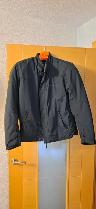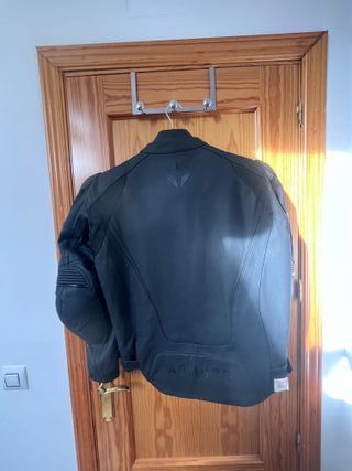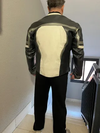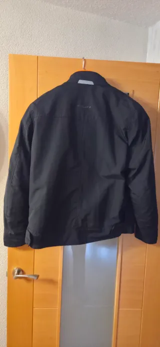 Chaqueta de moto para hombre, en color negro. Está en buen estado. - Es de talla L. - Tiene un diseño elegante y moderno. - Es perfecta para cualquier ocasión. Ideal para ir formal a la oficina, tipo 3/4, tiene un rasguño en el hombro izquierdo (ver foto), por lo demás esta para usar durante mucho tiempo, todas las cremalleras perfectas, abriga mucho, protecciones en codos y espalda. Cambio por otra chaqueta que me interese.