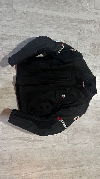 Chaqueta de moto SPYKE con diseño deportivo en negro y detalles en rojo. - Protecciones en hombros, codos y espalda. - Cierre frontal con cremallera. - Puños ajustables. - El precio incluye el forro interior y las protecciones. - Modelo: Spyke Aragon GT Dry Tecno. - Como nueva.