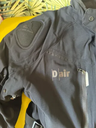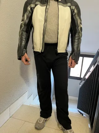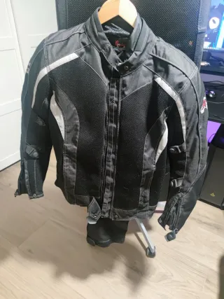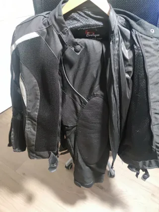 Chaqueta de moto Ixon de tres piezas. - Diseño moderno y funcional. - Cierre frontal con cremallera y botones. - Bolsillos laterales. - Cuello alto. Tiene desgastes de uso, pero aun puede usar por mucho tiempo