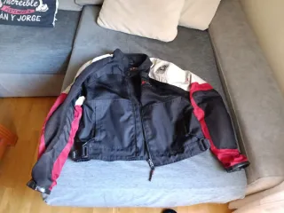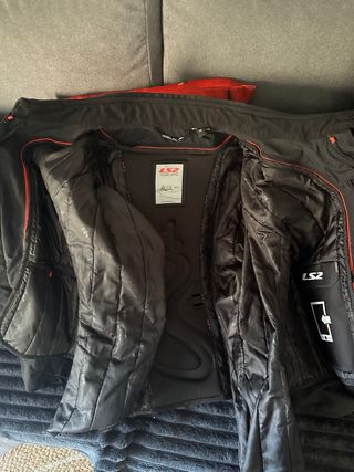 Chaqueta de moto LS2, ideal para el invierno. Diseño en color negro con detalles en rojo. - Marca: LS2 - Talla: M - Cierre de cremallera - Cuello alto - Forro interior acolchado extraible - Protectores de codos y hombros - Pantalon de la misma marca y modelo. - Forro acolchado extraible - Protectores de cadera y rodillas. - Unico detalle al final de la foto. Poco uso y bien cuidada