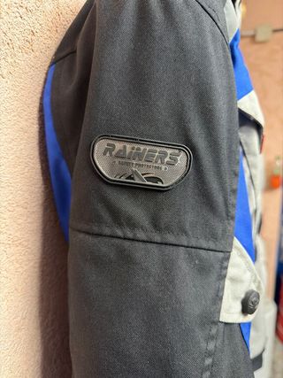 Chaqueta de motorista Rainers con diseño multicarbono. - Paneles en color azul y rojo. - Cremalleras en las mangas. - Cierre frontal con botones a presión y cremallera. Protecciones en espalda, hombros y codos. En muy buen estado, puesta en contadas ocasiones. Talla XL