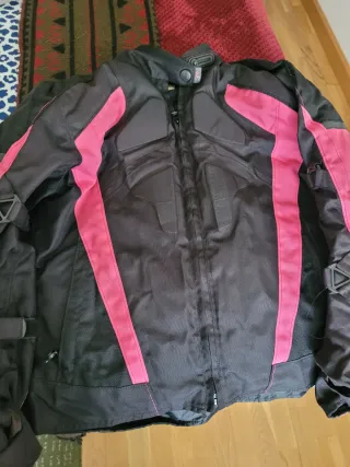 Chaqueta de motorista para mujer, ideal para rutas. - Diseño en color negro con costuras en rosa. - Paneles de malla para ventilación. - Cuello alto con cierre. - Todas las estaciones. Se pueden quitar capas. - Protección en codos, hombros y espalda. - Muy poco uso