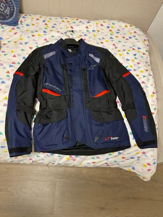 Chaqueta de moto Alpinestars en color azul marino y negro, talla S. Es un modelo nuevo, ideal para rutas de turismo, se la puso una vez y ya no la volvió a usar más. - Cierre principal con cremallera y solapa. - Tiene coderas - Múltiples bolsillos frontales. - Ajustes en cintura y puños. - Detalles reflectantes.