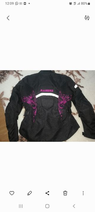 Conjunto de chaqueta y pantalón de cordura para moto, diseñado para chica. El traje es de color negro con detalles en rosa. - Chaqueta y pantalón con cinturón ajustable. - Pantalón y chaqueta con refuerzos. - Detalles reflectantes. -forro interior con cremallera. -Talla S -como nuevo,poco uso