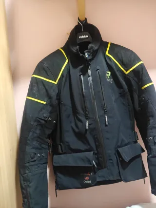 Traje de moto Rukka de alta calidad, ideal para cualquier clima. - Color negro con detalles amarillos. - Membrana Gore-Tex para impermeabilidad y transpirabilidad. - Protecciones en hombros , codos , pecho y espalda - protección en rodillas y caderas Protecciónes de primera calidad - Bolsillos frontales y laterales. - Cierre de cremallera frontal. Traje completo, impermeable 💯 x 💯 , demostrable Forro interio adicional para bajas temperaturas, incluso bajo 0 Chaqueta y pantalón con tirantes, que se unen mediante cremallera.