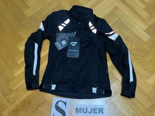 NUEVA A ESTRENAR. Chaqueta de moto negra con detalles reflectantes. IMPERMEABLE. Talla S. 41 cms de axila a axila. Teóricamente sería como para mujer. Incluye protecciones en los codos.Hombros y espalda. Varios bolsillos tanto exteriores como interiores. - Diseño moderno y funcional. - Material resistente y transpirable. - Cierres ajustables en cintura y mangas. - Logos de la marca visibles. Hago envíos o recogida en mano. Mira mis valoraciones.