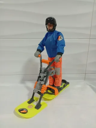 Figura de Action Man con su bicicleta de nieve, lanza un misil. • PRECIO NO NEGOCIABLE - Incluye casco negro. - Chaqueta azul con logo. - Pantalones naranjas. - Guantes grises. - Moto de nieve amarilla con detalles naranjas y grises.