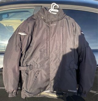Chaqueta de moto negra con tecnología Gore-Tex. Es como una talla L de ropa de vestir normal. - Forro interior desmontable. - Impermeable. - Protecciones en codos y hombros. - Material exterior resistente. - Cuello alto con cierre. - Cinturón ajustable en la cintura. - Puños elásticos. - Logo de Teknic en la parte inferior.