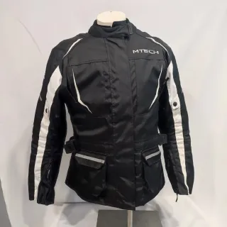 Chaqueta de moto Mtech para mujer en talla XL. Diseño moderno y funcional. Con forro interior desmontable y protecciones duras en codos hombros y antebrazos - Color negro con detalles blancos. - Cierre de cremallera frontal. - Bolsillos frontales con solapa. - Cinturón ajustable en la cintura. - Puños con cremallera y ajuste. - Detalles reflectantes en bolsillos y mangas.