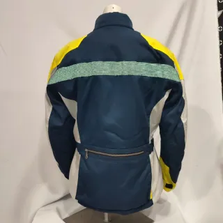 Chaqueta de moto con un diseño moderno y deportivo. - Combinación de colores azul y gris. - Cierre frontal con cremallera. - Bolsillos exteriores. - Forro interior acolchado.