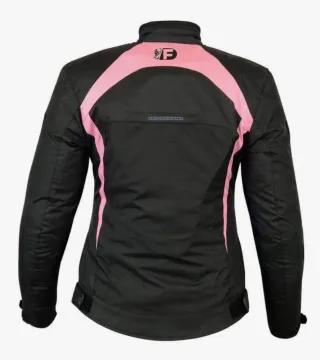 Chaqueta de moto para mujer, con un diseño moderno en negro y detalles en rosa. Cuenta con un forro interior desmontable para adaptarse a diferentes temperaturas. - Diseño bicolor: negro y rosa. - Forro desmontable incluido.