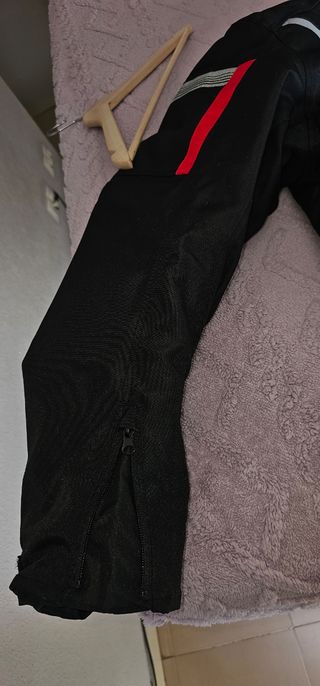 Conjunto de ropa de moto Dainese, chaqueta y pantalón, que se pueden usar por separado. - Chaqueta negra con detalles rojos y blancos. - Pantalones negros con logo Dainese.