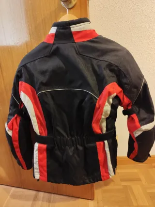 chaqueta de protección para moto. Talla de niño XL. También para mujer equivalente a una talla S que es como yo la he usado. Mido 1.68 y peso 55 kg. Protecciones en codos, hombros y espalda. Apta para invierno y verano, ya que se puede quitar el forro interior mediante cremallera y lavar sin problema y todo en la lavadora. Con ventilaciones que se abren y se cierran con cremalleras.
