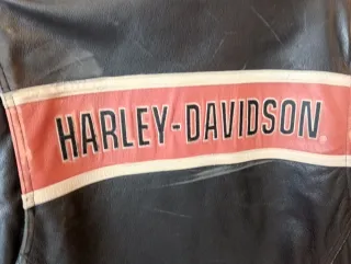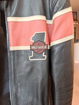 Chaqueta de piel para moto con el icónico diseño de Harley-Davidson. - Material: Piel. - Diseño: Banda frontal en color coral con el logo de Harley-Davidson. - Color: Negro.