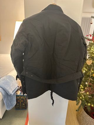 Chaqueta de moto en talla M, diseñada para carretera. - Color negro. - Cierre frontal con cremallera y solapa. - Cinturón ajustable en la cintura. - Detalles reflectantes en mangas y frontal. - Forro térmico desmontable . - Cuello alto con cierre de velcro. -Protecciones en espalda, hombros y codos.