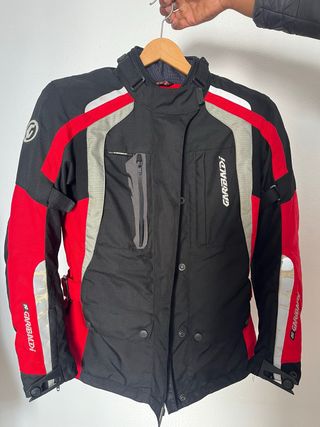 Chaqueta de motorista en colores rojo y negro de la marca GARIBALDI. - Diseñada para mujer - tamaño S (yo mido 174 cm) - Cuenta con detalles reflectantes para mayor visibilidad. - Cierre frontal con cremallera y solapa. - protecciones duras en rodillas y codos Recogida posible a partir del 23 de febrero.